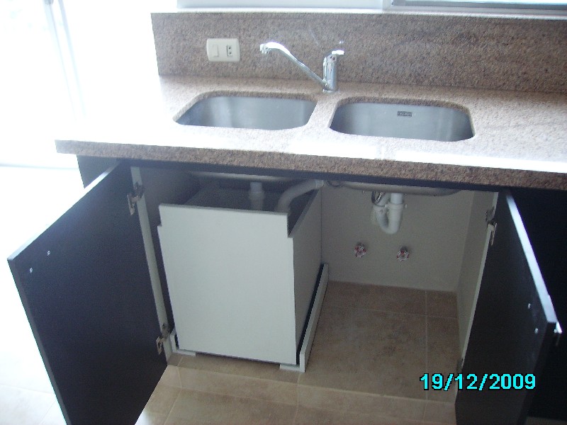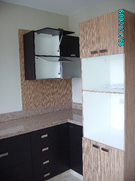 Anaqueles de Cocina : Madera RH tropical melaminico por dentro y por fuera anaqueles superiores e interiores con cajonera, una torre para horno y microondas. Lavaplato de dos pozos Teka.